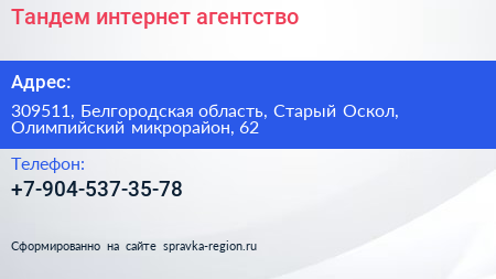 Тандем, интернет-агентство по адресу 309511, Белгородская область, Старый Оскол, Олимпийский микрорайон, 62 в дальнейшем Организация, размещена в следующих категориях: