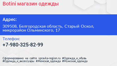 Botini, магазин одежды по адресу 309508, Белгородская область, Старый Оскол, микрорайон Ольминского, 17 в дальнейшем Организация, размещена в следующих категориях:
