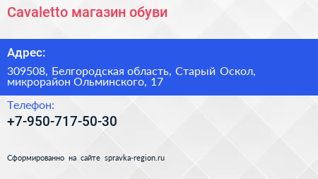 Cavaletto, магазин обуви по адресу 309508, Белгородская область, Старый Оскол, микрорайон Ольминского, 17 в дальнейшем Организация, размещена в следующих категориях: