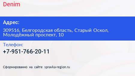 Denim по адресу 309516, Белгородская область, Старый Оскол, Молодёжный проспект, 10 в дальнейшем Организация, размещена в следующих категориях: