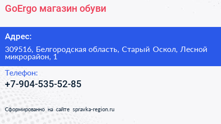 GoErgo, магазин обуви по адресу 309516, Белгородская область, Старый Оскол, Лесной микрорайон, 1 в дальнейшем Организация, размещена в следующих категориях:
