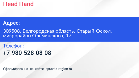 Head & Hand по адресу 309508, Белгородская область, Старый Оскол, микрорайон Ольминского, 17 в дальнейшем Организация, размещена в следующих категориях: