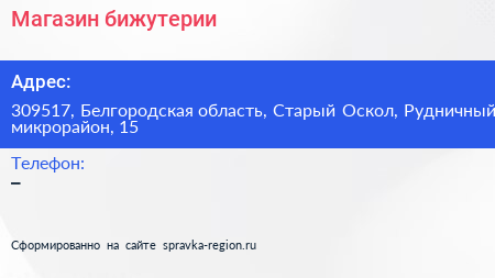 Магазин бижутерии по адресу 309517, Белгородская область, Старый Оскол, Рудничный микрорайон, 15 в дальнейшем Организация, размещена в следующих категориях: