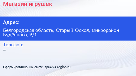 Магазин игрушек по адресу Белгородская область, Старый Оскол, микрорайон Будённого, 9/1 в дальнейшем Организация, размещена в следующих категориях: