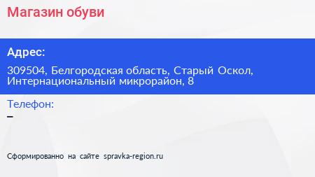Магазин обуви по адресу 309504, Белгородская область, Старый Оскол, Интернациональный микрорайон, 8 в дальнейшем Организация, размещена в следующих категориях: