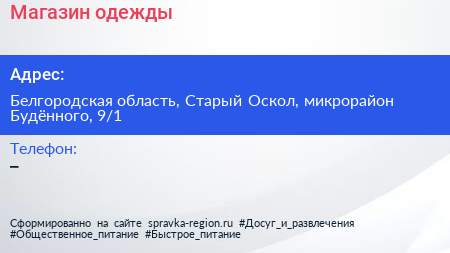 Магазин одежды по адресу Белгородская область, Старый Оскол, микрорайон Будённого, 9/1 в дальнейшем Организация, размещена в следующих категориях: