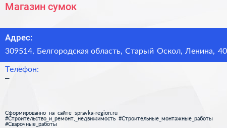 Магазин сумок по адресу 309514, Белгородская область, Старый Оскол, Ленина, 40 в дальнейшем Организация, размещена в следующих категориях:
