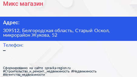 Микс, магазин по адресу 309512, Белгородская область, Старый Оскол, микрорайон Жукова, 52 в дальнейшем Организация, размещена в следующих категориях:
