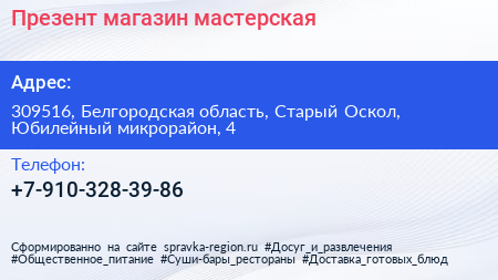 Презент, магазин-мастерская по адресу 309516, Белгородская область, Старый Оскол, Юбилейный микрорайон, 4 в дальнейшем Организация, размещена в следующих категориях: