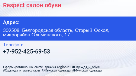 Respect, салон обуви по адресу 309508, Белгородская область, Старый Оскол, микрорайон Ольминского, 17 в дальнейшем Организация, размещена в следующих категориях:
