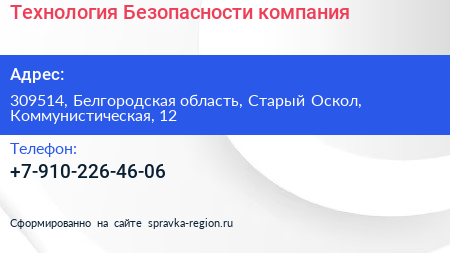 Технология Безопасности, компания по адресу 309514, Белгородская область, Старый Оскол, Коммунистическая, 12 в дальнейшем Организация, размещена в следующих категориях: