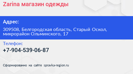 Zarina, магазин одежды по адресу 309508, Белгородская область, Старый Оскол, микрорайон Ольминского, 17 в дальнейшем Организация, размещена в следующих категориях: