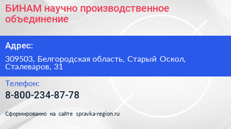 БИНАМ, научно-производственное объединение по адресу 309503, Белгородская область, Старый Оскол, Сталеваров, 31 в дальнейшем Организация, размещена в следующих категориях:
