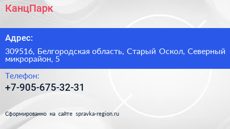 КанцПарк по адресу 309516, Белгородская область, Старый Оскол, Северный микрорайон, 5 в дальнейшем Организация, размещена в следующих категориях: