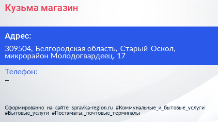 Кузьма, магазин по адресу 309504, Белгородская область, Старый Оскол, микрорайон Молодогвардеец, 17 в дальнейшем Организация, размещена в следующих категориях: