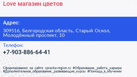 Love, магазин цветов по адресу 309516, Белгородская область, Старый Оскол, Молодёжный проспект, 10 в дальнейшем Организация, размещена в следующих категориях: