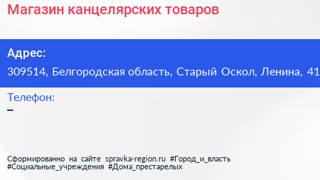 Магазин канцелярских товаров по адресу 309514, Белгородская область, Старый Оскол, Ленина, 41 в дальнейшем Организация, размещена в следующих категориях: