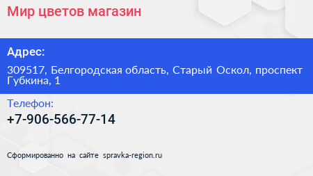 Мир цветов, магазин по адресу 309517, Белгородская область, Старый Оскол, проспект Губкина, 1 в дальнейшем Организация, размещена в следующих категориях: