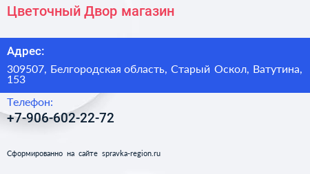 Цветочный Двор, магазин по адресу 309507, Белгородская область, Старый Оскол, Ватутина, 153 в дальнейшем Организация, размещена в следующих категориях:
