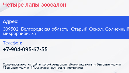 Четыре лапы, зоосалон по адресу 309502, Белгородская область, Старый Оскол, Солнечный микрорайон, 7а в дальнейшем Организация, размещена в следующих категориях: