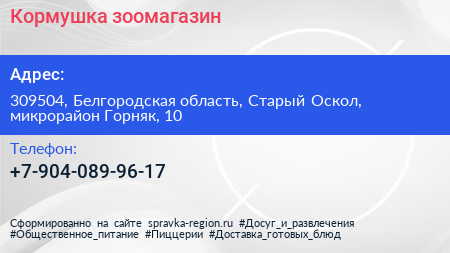 Кормушка, зоомагазин по адресу 309504, Белгородская область, Старый Оскол, микрорайон Горняк, 10 в дальнейшем Организация, размещена в следующих категориях: