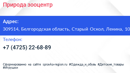 Природа, зооцентр по адресу 309514, Белгородская область, Старый Оскол, Ленина, 10 в дальнейшем Организация, размещена в следующих категориях: