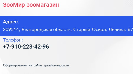 ЗооМир, зоомагазин по адресу 309514, Белгородская область, Старый Оскол, Ленина, 67 в дальнейшем Организация, размещена в следующих категориях: