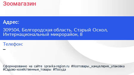 Зоомагазин по адресу 309504, Белгородская область, Старый Оскол, Интернациональный микрорайон, 8 в дальнейшем Организация, размещена в следующих категориях: