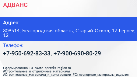 АДВАНС по адресу 309514, Белгородская область, Старый Оскол, 17 Героев, 12 в дальнейшем Организация, размещена в следующих категориях: