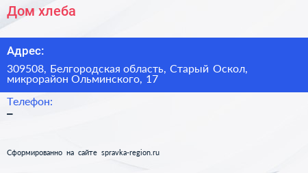 Дом хлеба по адресу 309508, Белгородская область, Старый Оскол, микрорайон Ольминского, 17 в дальнейшем Организация, размещена в следующих категориях: