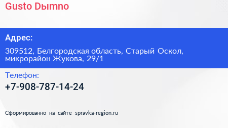 Gusto Dыmno по адресу 309512, Белгородская область, Старый Оскол, микрорайон Жукова, 29/1 в дальнейшем Организация, размещена в следующих категориях: