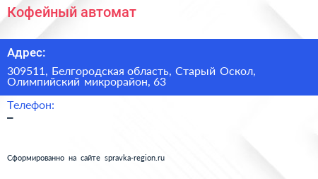 Кофейный автомат по адресу 309511, Белгородская область, Старый Оскол, Олимпийский микрорайон, 63 в дальнейшем Организация, размещена в следующих категориях: