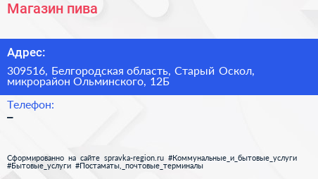 Магазин пива по адресу 309516, Белгородская область, Старый Оскол, микрорайон Ольминского, 12Б в дальнейшем Организация, размещена в следующих категориях: