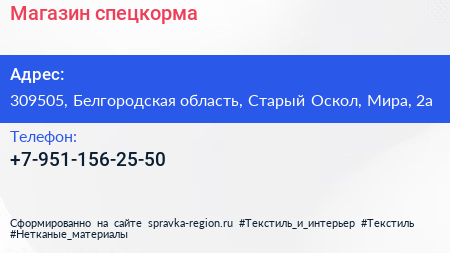 Магазин спецкорма по адресу 309505, Белгородская область, Старый Оскол, Мира, 2а в дальнейшем Организация, размещена в следующих категориях: