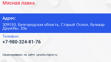 Мясная лавка по адресу 309510, Белгородская область, Старый Оскол, бульвар Дружбы, 10а в дальнейшем Организация, размещена в следующих категориях: