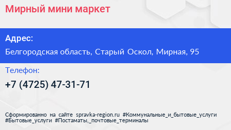 Мирный, мини-маркет по адресу Белгородская область, Старый Оскол, Мирная, 95 в дальнейшем Организация, размещена в следующих категориях: