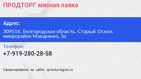 ПРОДТОРГ, мясная лавка по адресу 309516, Белгородская область, Старый Оскол, микрорайон Макаренко, 3а в дальнейшем Организация, размещена в следующих категориях: