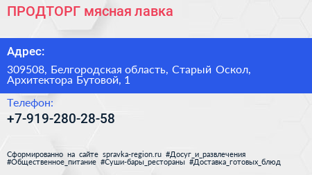 ПРОДТОРГ, мясная лавка по адресу 309508, Белгородская область, Старый Оскол, Архитектора Бутовой, 1 в дальнейшем Организация, размещена в следующих категориях:
