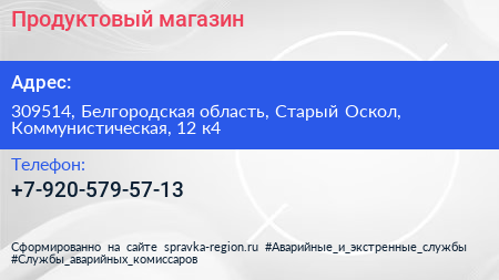 Продуктовый магазин по адресу 309514, Белгородская область, Старый Оскол, Коммунистическая, 12 к4 в дальнейшем Организация, размещена в следующих категориях: