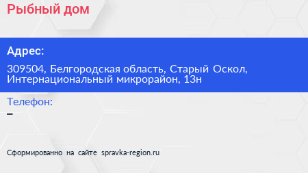Рыбный дом по адресу 309504, Белгородская область, Старый Оскол, Интернациональный микрорайон, 13н в дальнейшем Организация, размещена в следующих категориях: