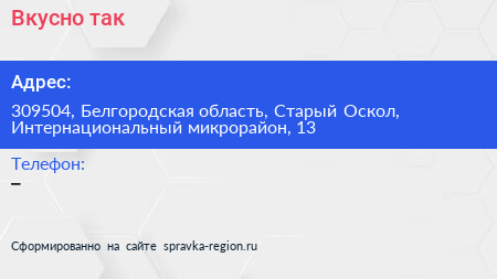 Вкусно так по адресу 309504, Белгородская область, Старый Оскол, Интернациональный микрорайон, 13 в дальнейшем Организация, размещена в следующих категориях: