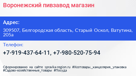 Воронежский пивзавод, магазин по адресу 309507, Белгородская область, Старый Оскол, Ватутина, 205а в дальнейшем Организация, размещена в следующих категориях: