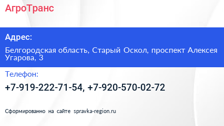 АгроТранс по адресу Белгородская область, Старый Оскол, проспект Алексея Угарова, 3 в дальнейшем Организация, размещена в следующих категориях: