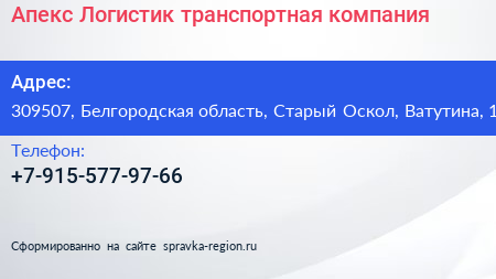Апекс-Логистик, транспортная компания по адресу 309507, Белгородская область, Старый Оскол, Ватутина, 1 в дальнейшем Организация, размещена в следующих категориях: