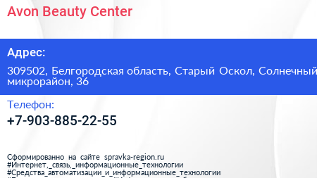 Avon Beauty Center по адресу 309502, Белгородская область, Старый Оскол, Солнечный микрорайон, 36 в дальнейшем Организация, размещена в следующих категориях: