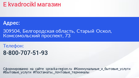 E-kvadrocikl, магазин по адресу 309504, Белгородская область, Старый Оскол, Комсомольский проспект, 73 в дальнейшем Организация, размещена в следующих категориях: