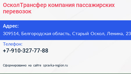 ОсколТрансфер, компания пассажирских перевозок по адресу 309514, Белгородская область, Старый Оскол, Ленина, 23 в дальнейшем Организация, размещена в следующих категориях: