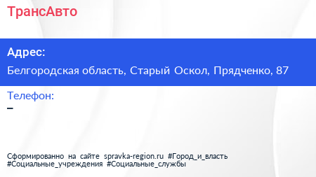 ТрансАвто по адресу Белгородская область, Старый Оскол, Прядченко, 87 в дальнейшем Организация, размещена в следующих категориях: