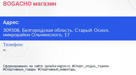 BOGACHO, магазин по адресу 309508, Белгородская область, Старый Оскол, микрорайон Ольминского, 17 в дальнейшем Организация, размещена в следующих категориях: