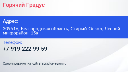 Горячий Градус по адресу 309516, Белгородская область, Старый Оскол, Лесной микрорайон, 15а в дальнейшем Организация, размещена в следующих категориях:
